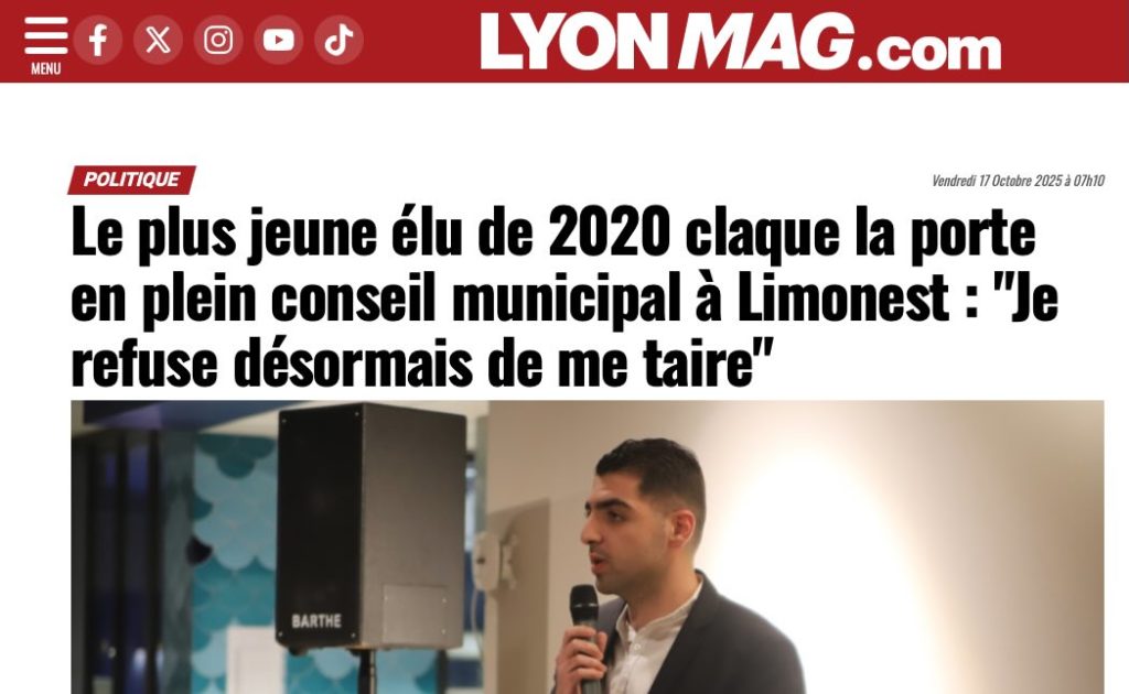 Article de Lyon MAG sur la démission d’Arthur NIGHOGHOSSIAN du poste de conseiller municipal délégué de Limonest. Dans son discours expliquant son choix, Arthur, NIGHOGHOSSIAN a justifié pourquoi il a démissionné refusant de cautionner la politique du maire actuel. Accéder à l’article de Lyon MAG